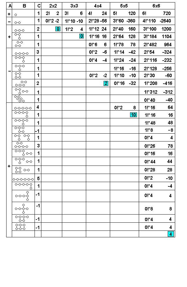stĺpcoch sú výpočty pre šachovnice 2x2 až 6x6. Na ľavej strane je naznačený