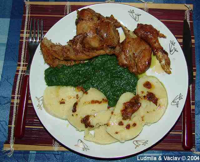 | Krůtí stehno se špenátem a s bramborovým knedlíkem.