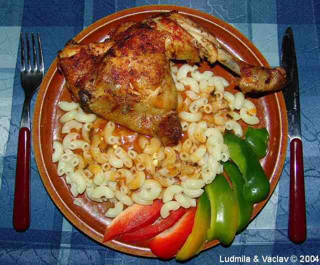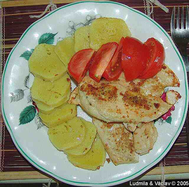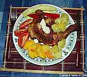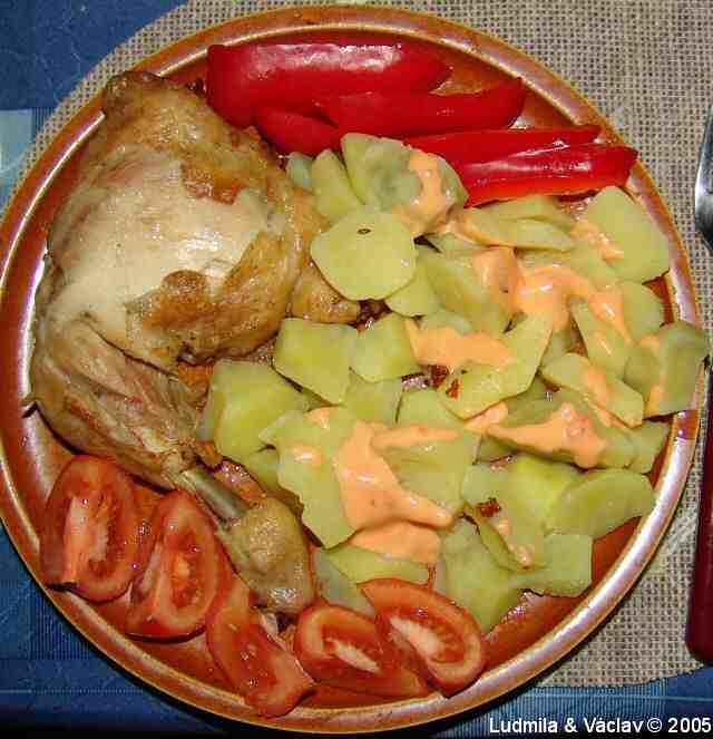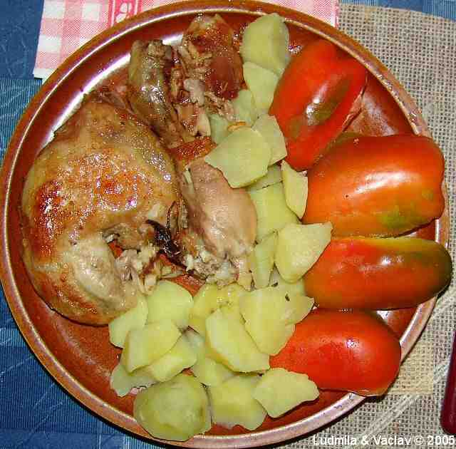 | Kuřecí stehenní lahůdka s bramborem, nektarinkou, s rajčaty a s paprikou.