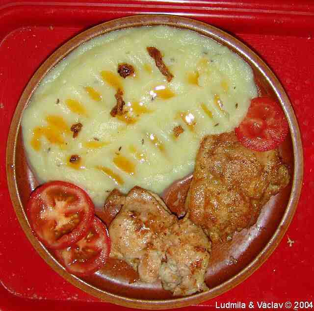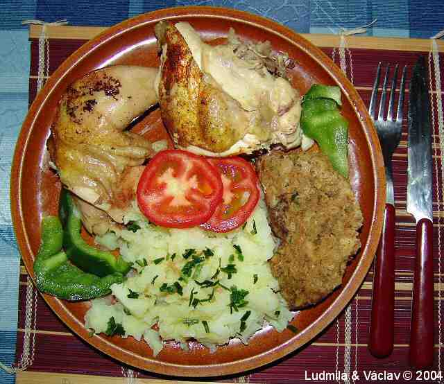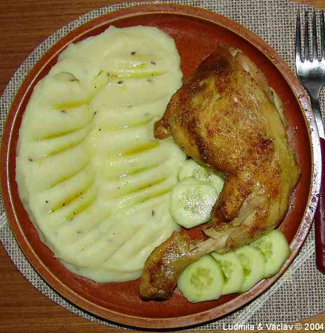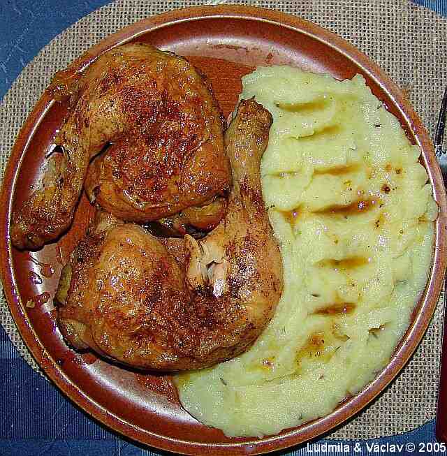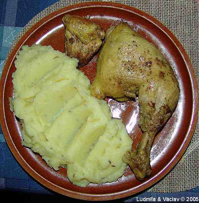 | Kuře pečené s bramborovou kaší.