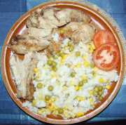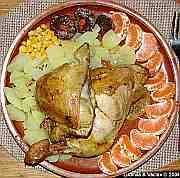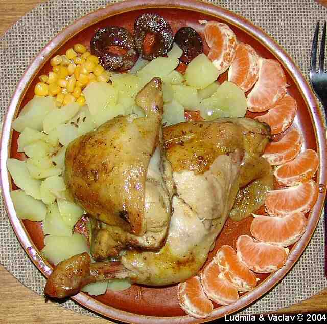 | Kuřecí stehýnka s bramborem, kukuřicí, mandarinkami a švestkou.