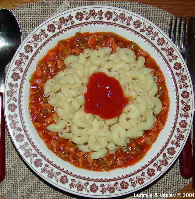 | Kuřecí lečo se sladkokyselou omáčkou. Příloha: těstoviny, kečup.