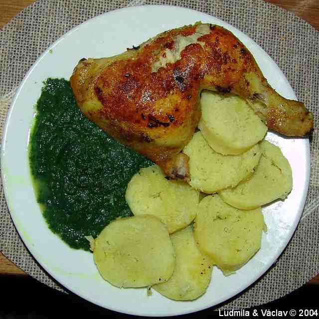 | Pečené kuřecí stehno na česneku se špenátem a bramborovými knedlíky.