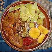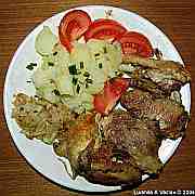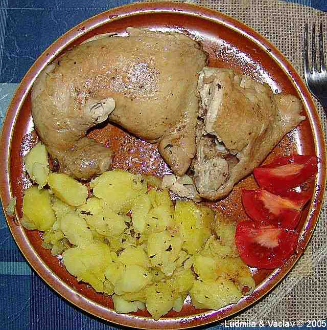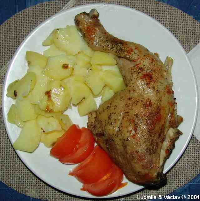 | Kuřecí stehno pečené s bylinkovým máslem, sušeným česnekem, muškátovým oříškem a grilovacím kořením s brambory a rajskými jablky.