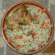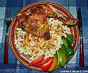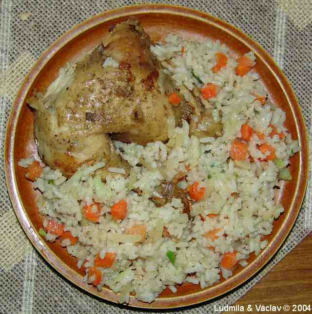 | Zeleninová rýže s kuřecím stehýnkem.