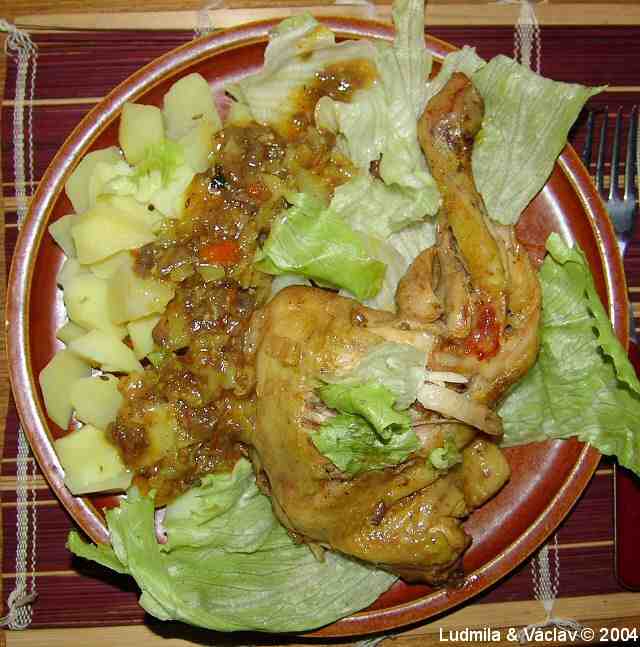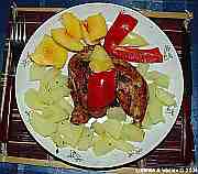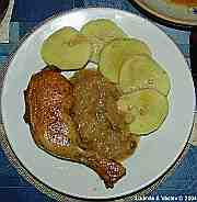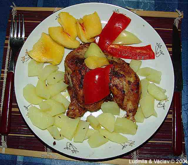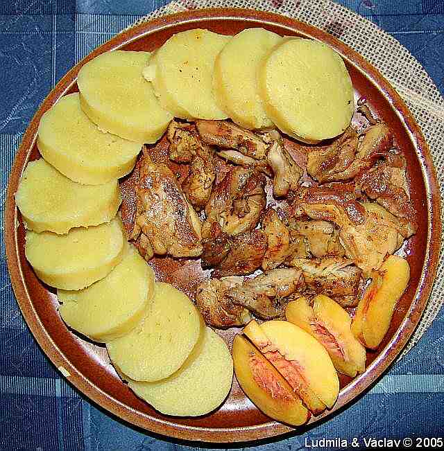 | Kuřecí stehýnko s bramborem a s broskví.