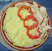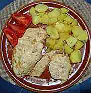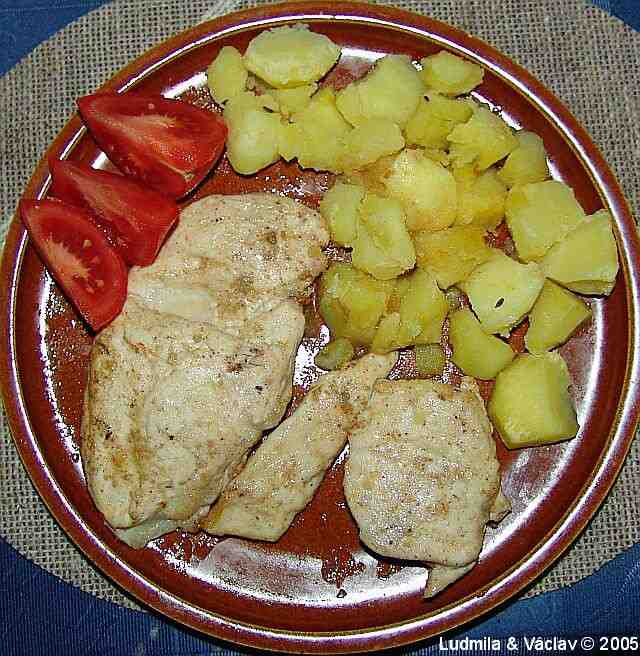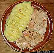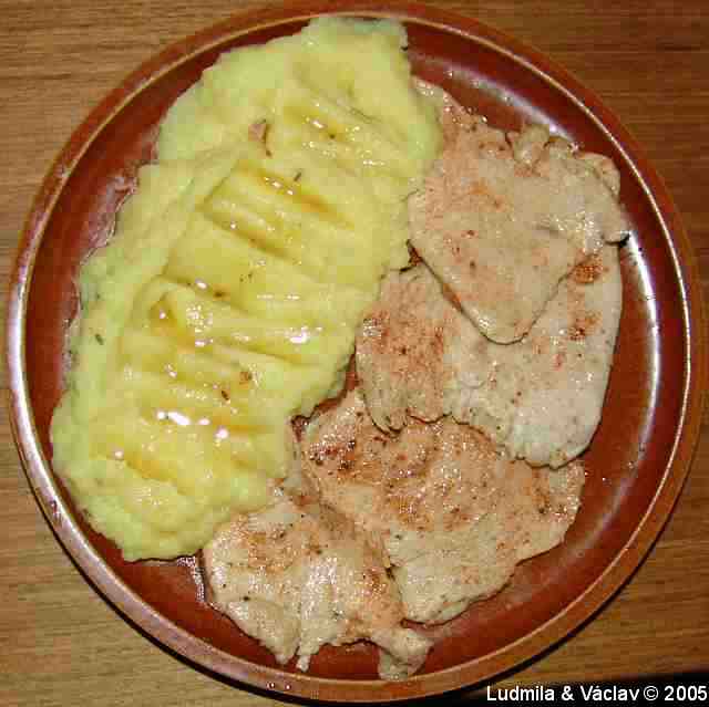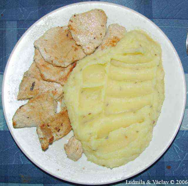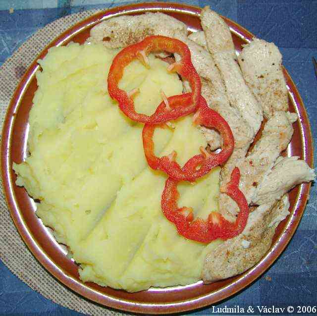 | Krůtí plátky na paprice a česneku s bramborovou kaší.