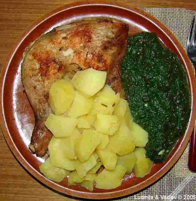 | Pečené kuřecí stehýnko s bramborem a se špenátem.