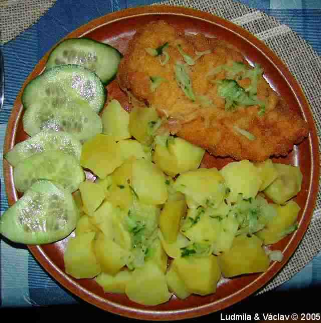 | Kuřecí řízek s bramborem a okurkou.