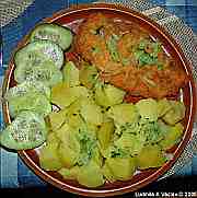 | Krůtí minutky s bramborem v rajčatovém sosu.