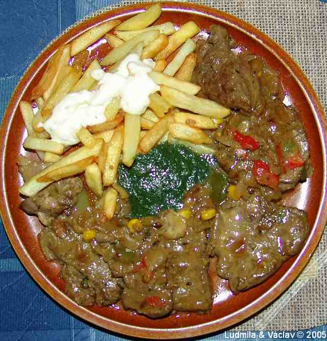 | Kuřecí jatýrka na cibulce po mexicku.