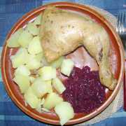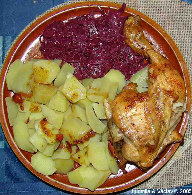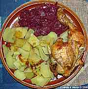 | Pečené kuřecí stehno, červené zelí, brambor.