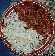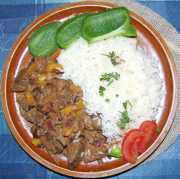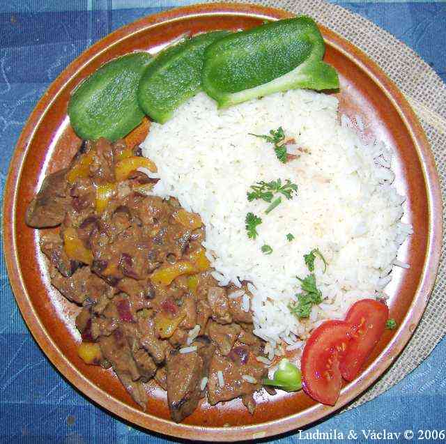 | Pikantní kuře s mexickými játry, rýží a paprikou.