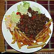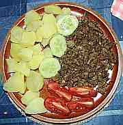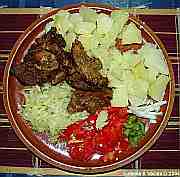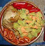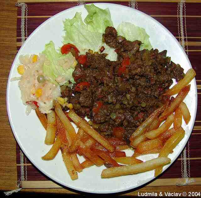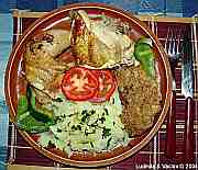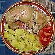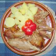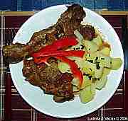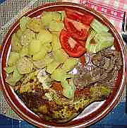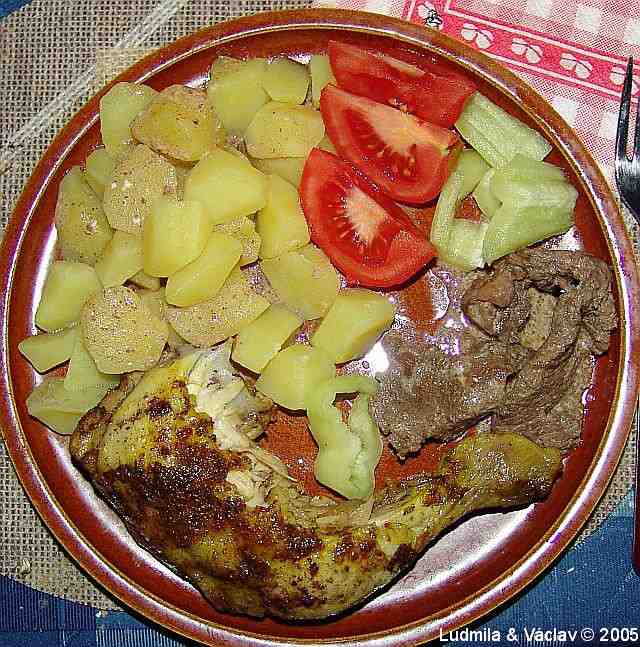| Kuřecí stehno doplněné hovězí přílohou s bramborem, rajčaty a paprikou.