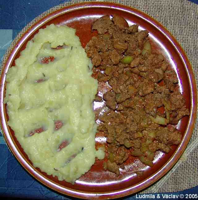 | Guláš s kuřecích jater s bramborovou kaší.
