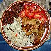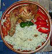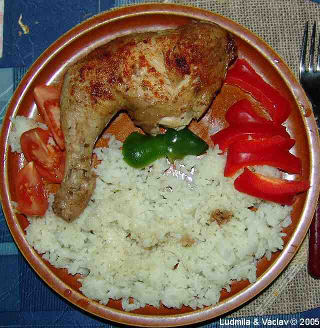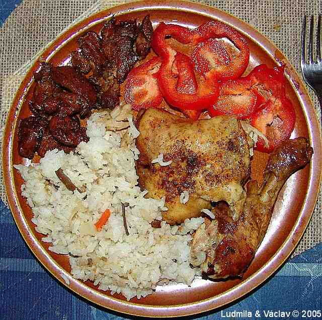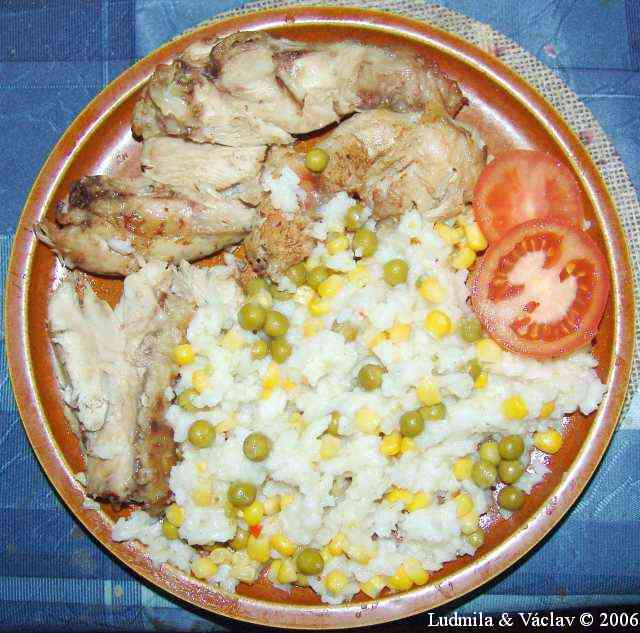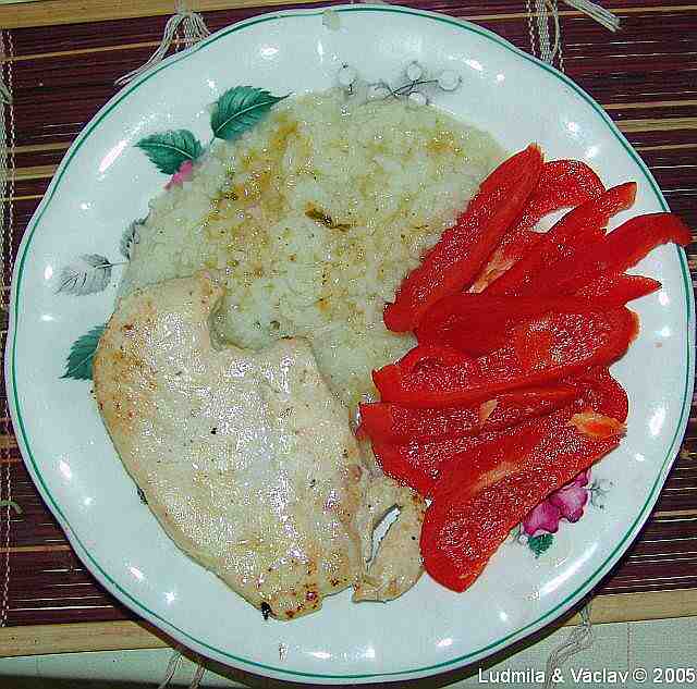 | Grilované kuře s rýží a s paprikami.
