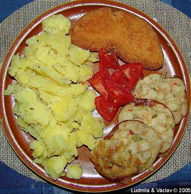 | Kuřecí obalovaný řízek s nádivkou a s bramborem.