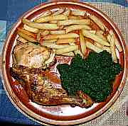 | Kuřecí stehno na česneku se špenátem a s hranolky.