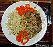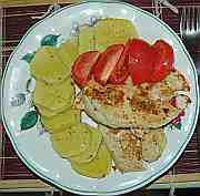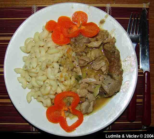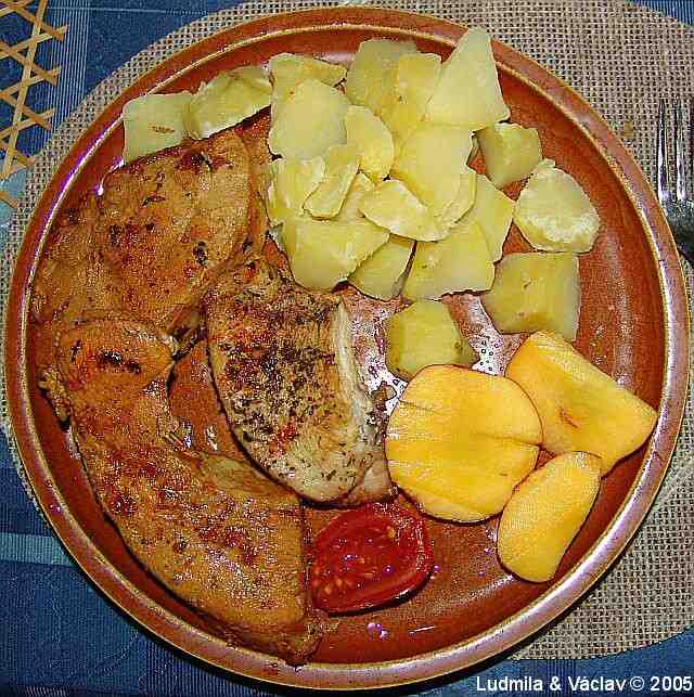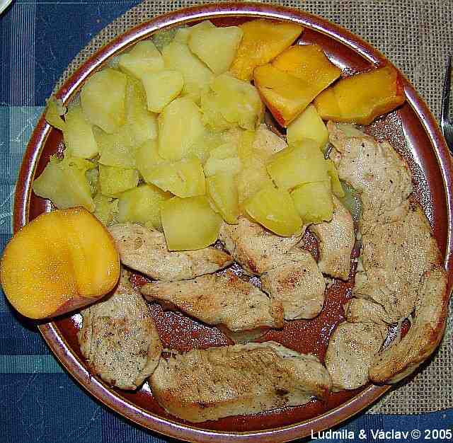 | Krůta v rajské omáčce s bramborem a s broskvemi.