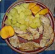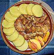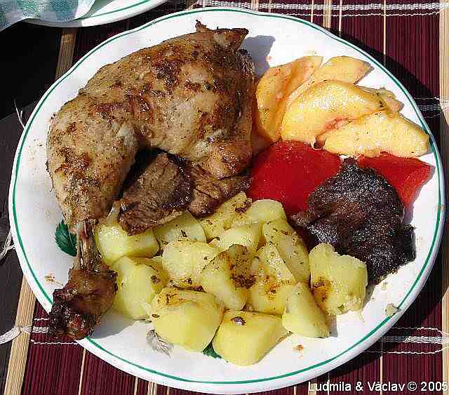 | Krůtí pečínka s bramborem a s broskvemi.