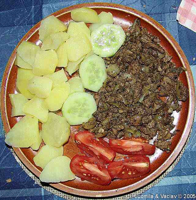 | Kuřecí játra na cibulce a na houbách s okurkou a s bramborem.