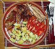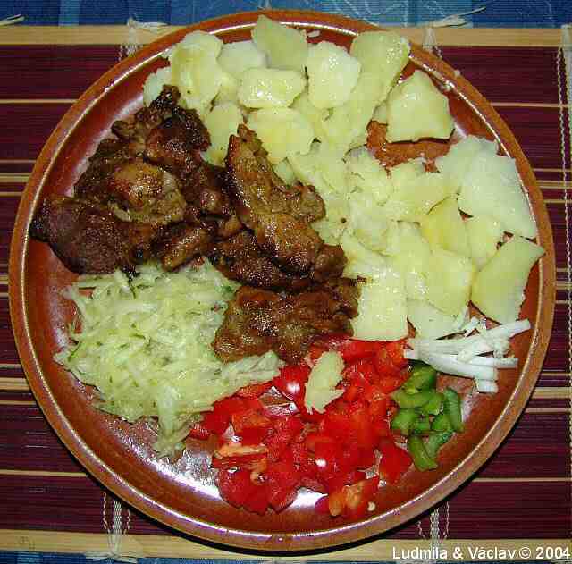 | Grilované kuře s bramborem a čínským zelím.