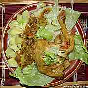 | Kuře v kari s bramborem na kmíně a s rajskými jablíčky.