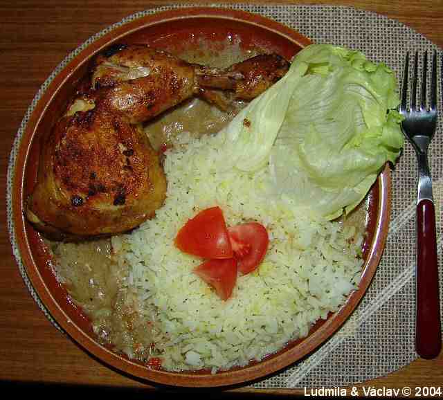 | Kuřecí pečínka s cibulovou omáčkou a s rýží.