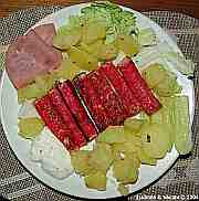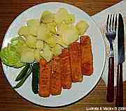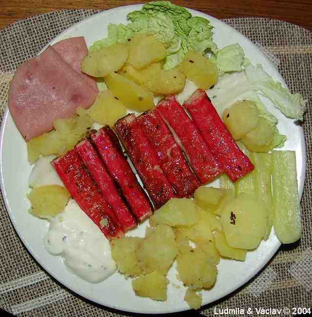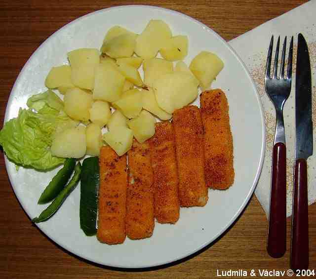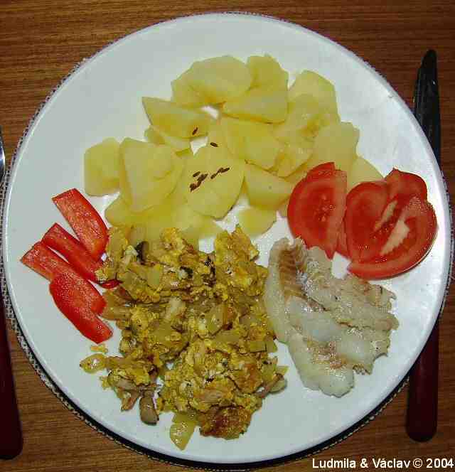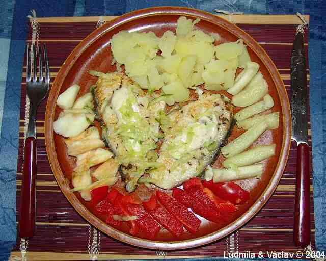 Rybí filety na česneku s bramborem, paprikami, okurkou s broskví a jablkem.