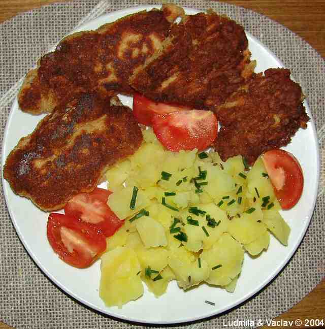 Smažená treska s vaječnou placičkou, bramborem a rajčaty.